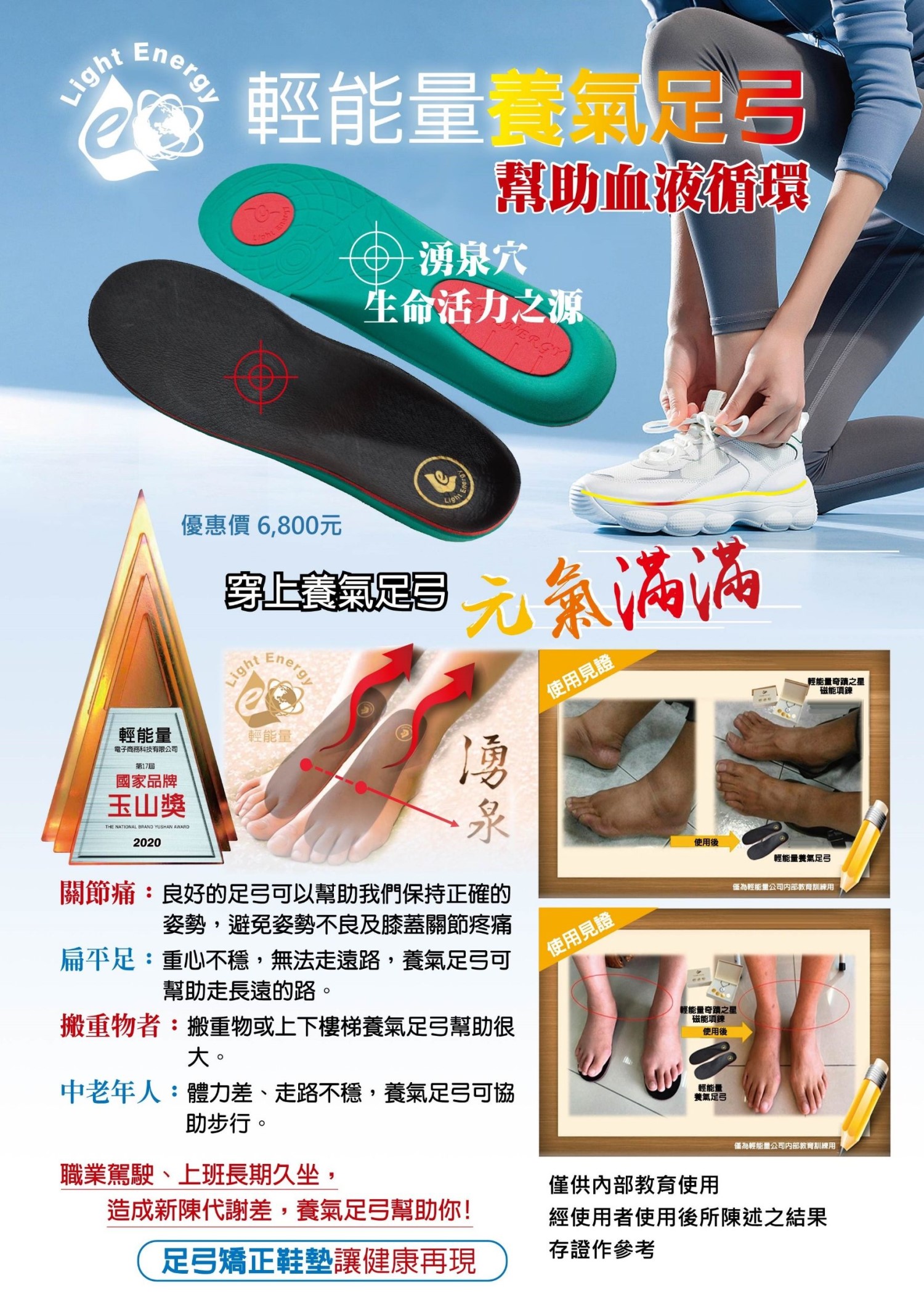 適用範圍:不分男女老幼皆可使用,有如人體的第二心臟-湧泉穴助血液達順暢,由下到上形成加速大循環!讓你攻頂玉山不是問題。榮獲多項國際組織推薦,世界衛生組織WHO、NGO世界針聯國際針灸、TCM緊急救援委員會推薦產品、WFA、SCIVA-USA等多項國際大獎。